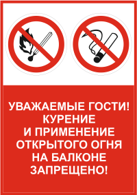Назначение: информирование постояльцев гостиниц, отелей, хостелов, а также жителей общежитий и квартир о запрете использования открытого огня и курения на балконах и лоджиях. Размещается на видном месте в зоне балкона/лоджии. Предназначен для владельцев гостиничного бизнеса, управляющих компаний и ответственных за пожарную безопасность для обеспечения соблюдения требований надзорных органов и профилактики пожаров.